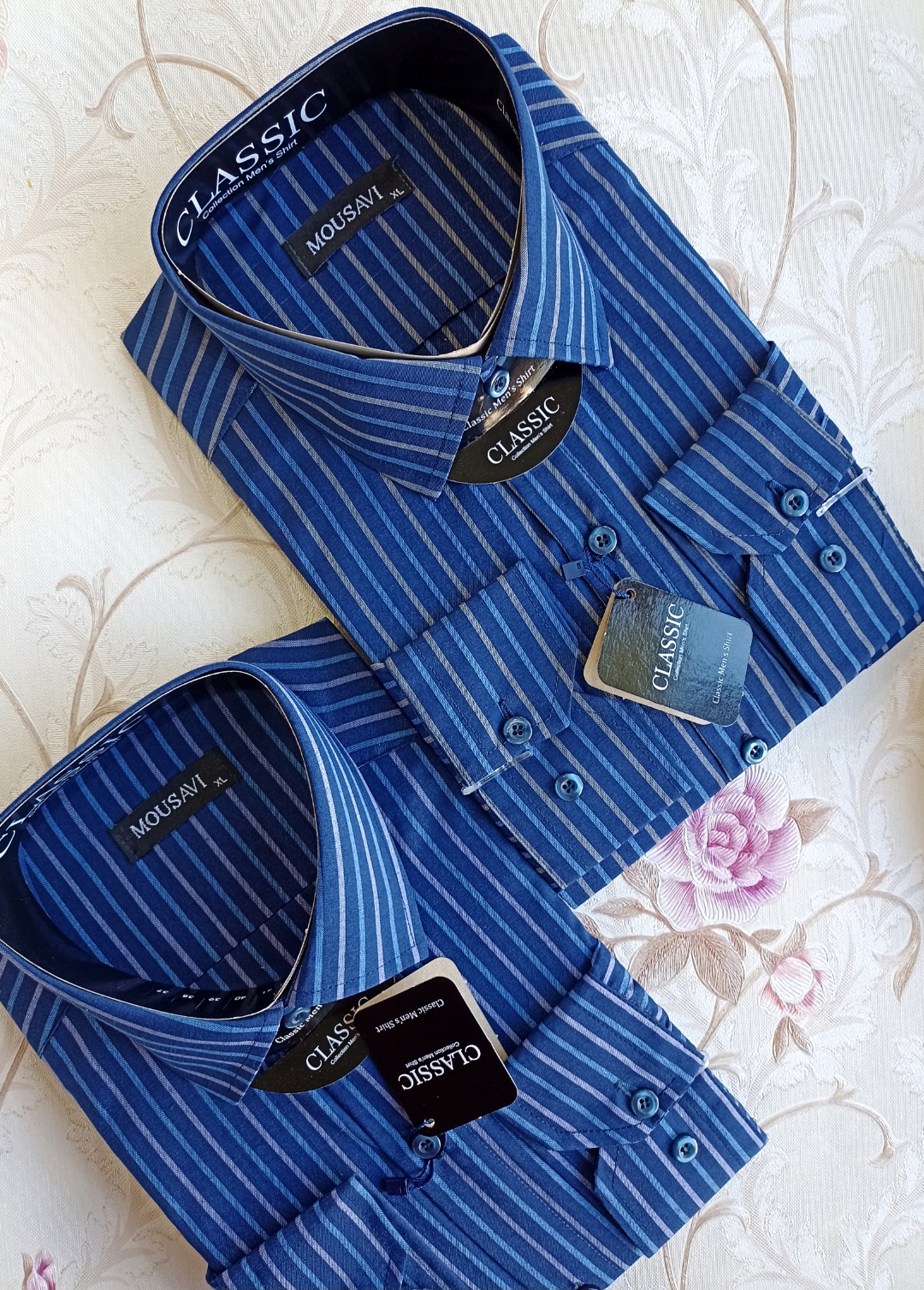 "✨ با پیراهن راهراه سرمهای، خود را در مرکز توجهات قرار دهید! 🔥 این پیراهن با طراحی شیک و رسمی، انتخابی بینظیر برای مهمانیها و موقعیتهای خاص است.